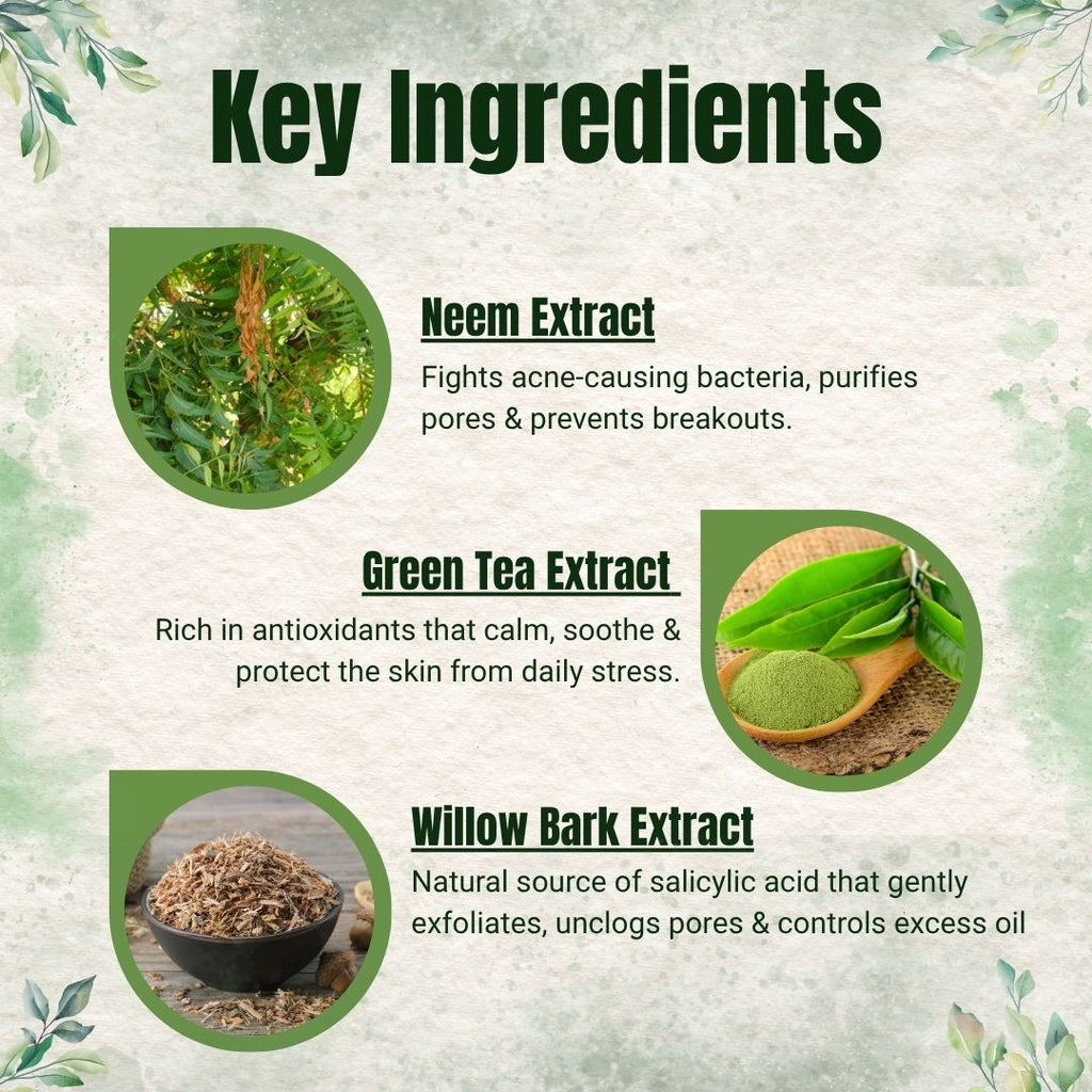 This refreshing formula combines three time-tested botanical actives — Neem, Green Tea, and Willow Bark — known for their skin-purifying and clarifying properties.