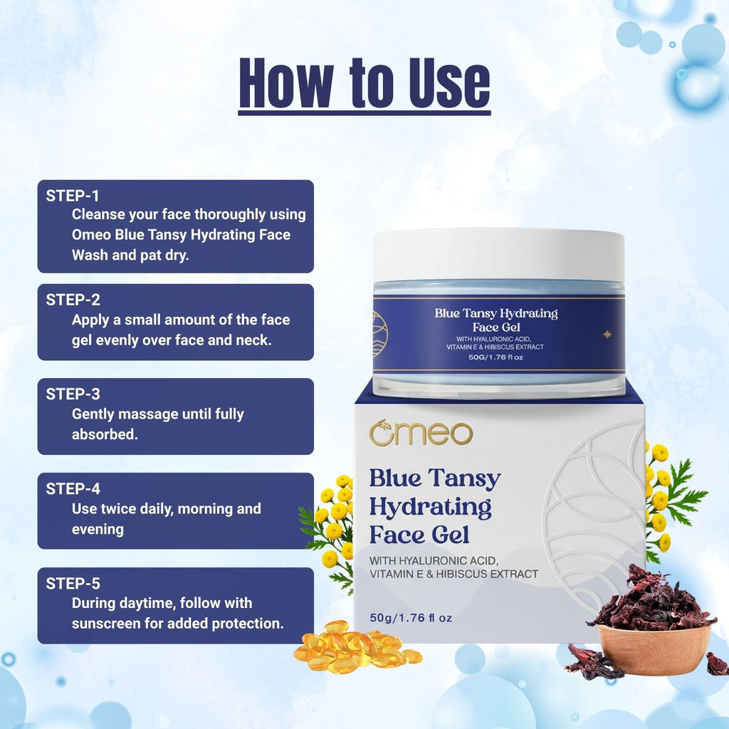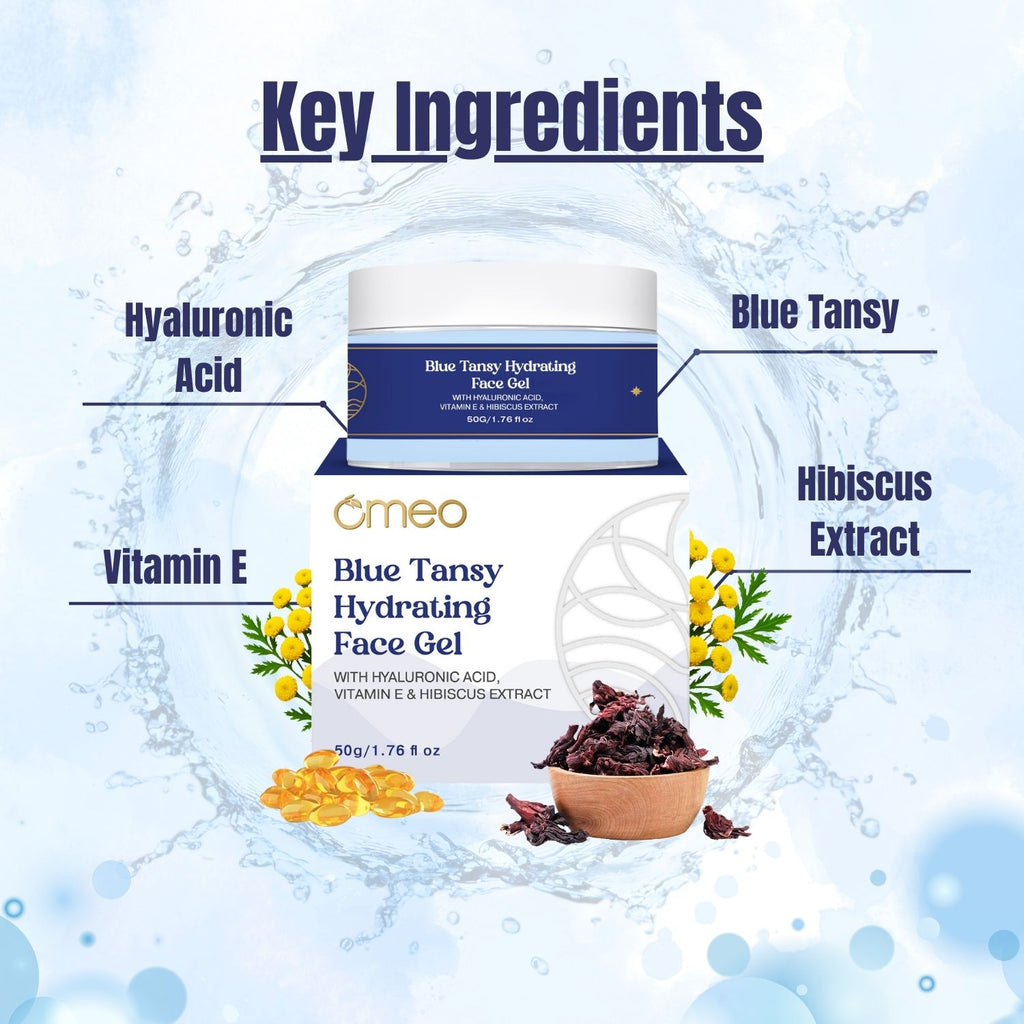 Omeo Blue Tansy Hydrating Face Gel is a lightweight, fast-absorbing moisturizer designed to deliver long-lasting hydration while calming and refreshing the skin. Infused with soothing Blue Tansy, deeply hydrating Hyaluronic Acid, nourishing Vitamin E, and antioxidant-rich Hibiscus Extract, this gel helps replenish moisture, improve skin texture, and restore a healthy, dewy glow.