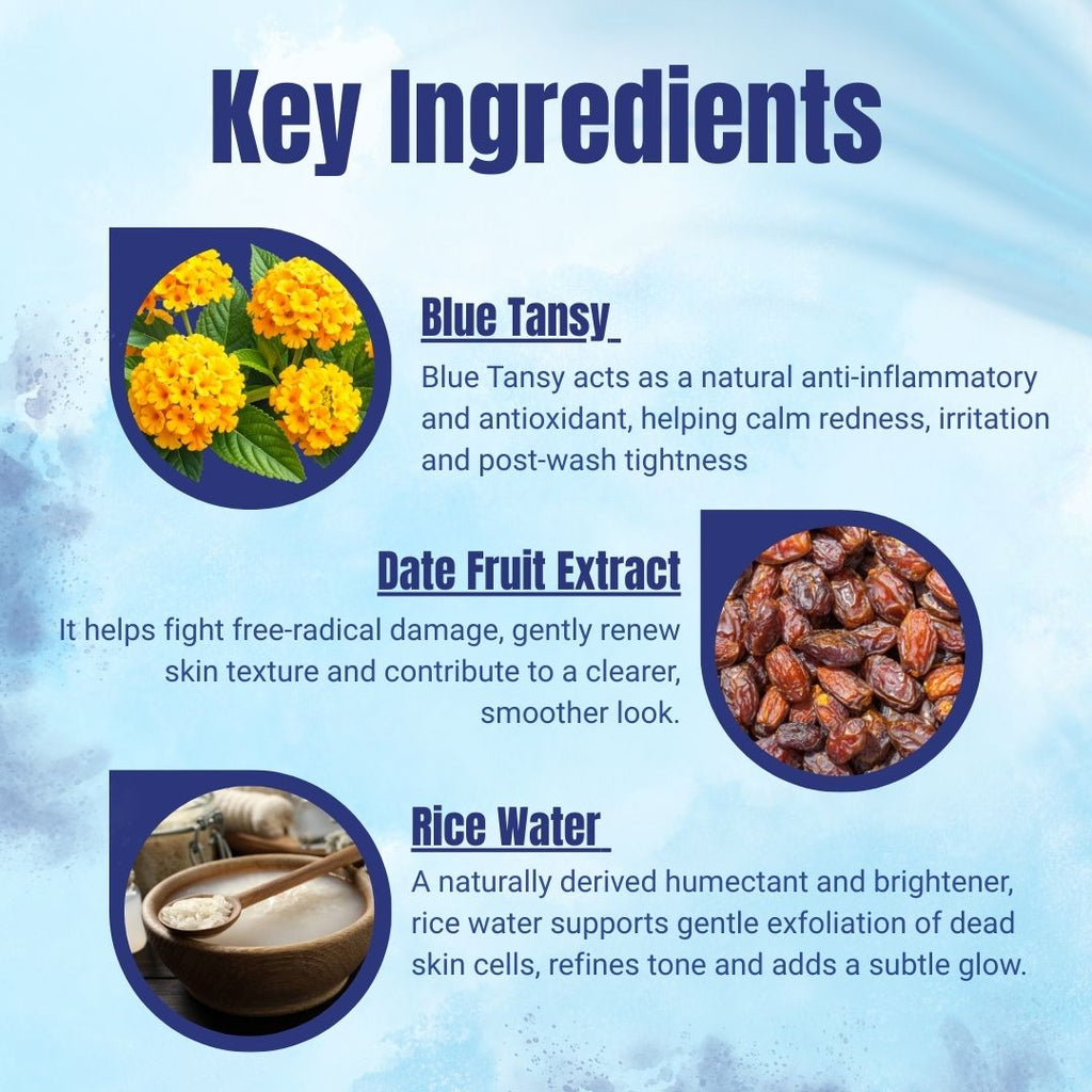 Blue Tansy – Known for its vivid blue colour and calming camphor-like aroma, Blue Tansy acts as a natural anti-inflammatory and antioxidant, helping calm redness, irritation and post-wash tightness.