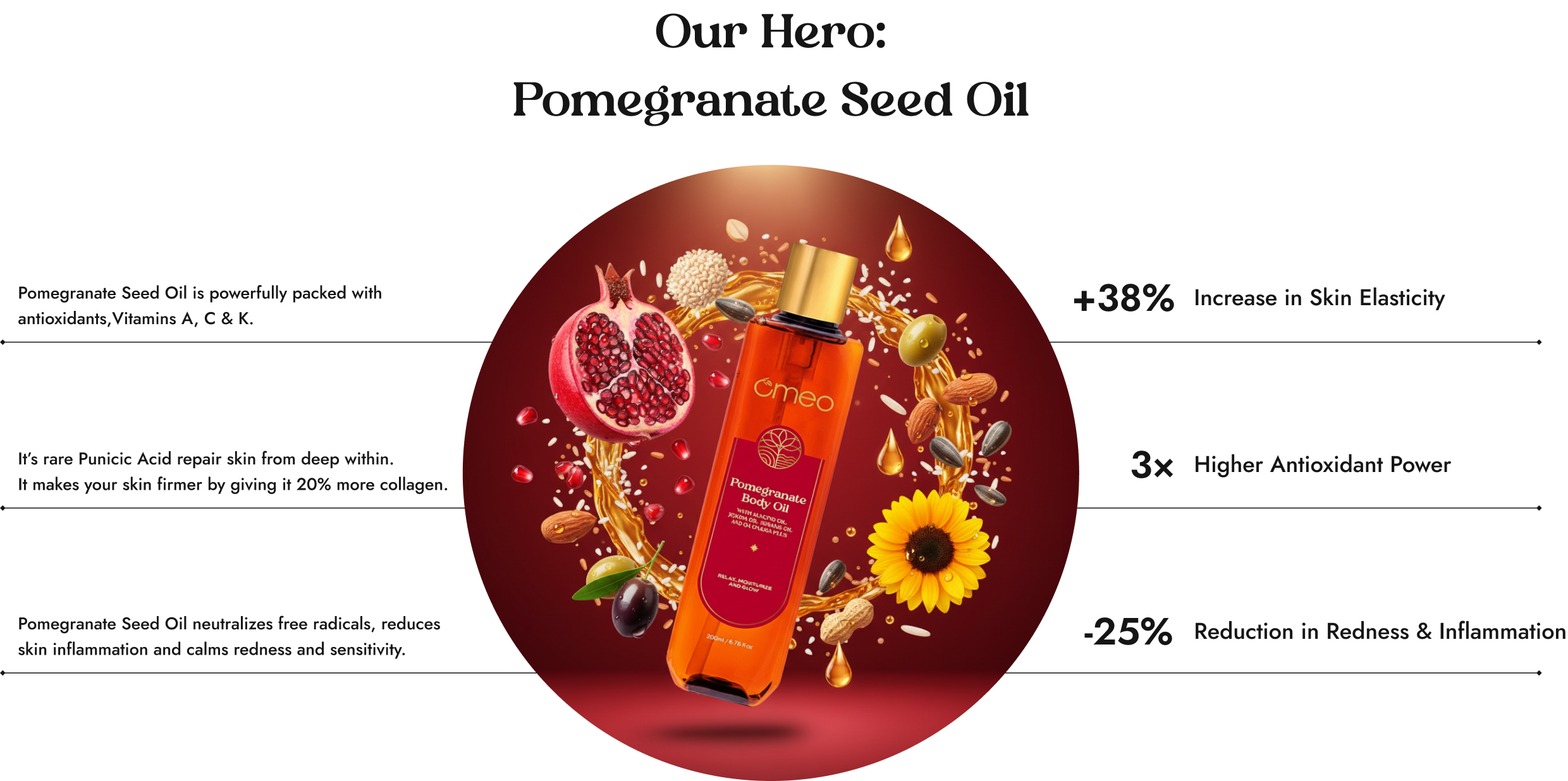 Pomegranate Oil: A massive reserve of Vitamin C. Pomegranate Oil is definitely a super food for your skin. Known as the Fruit of Life and often associated with fertility and abundance, this oil is said to have anti-aging, anti-oxidant and skin brightening properties.